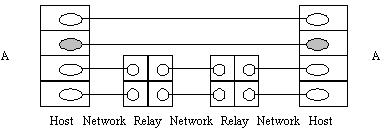 Very many different methods are used to connect networks together but it is possible to identify some common features. Interconnection takes place in a particular layer. In that layer and below, the networks are separate, above it, the networks appear as one. This is illustrated in figure 1 which shows two hosts connected across three networks with the networks being interconnected by systems termed "relays" (see below). Above the interface labelled "A" the protocols operate "end-to-end" ("host-to-host"). Below it, individual networks are visible and protocols are not end-to-end. Ideally the two shaded protocol entities should not be aware of the complexities which exist below them. For example, we would expect them to work perfectly happily if we eliminated the relays and attached the two hosts to a single network. We say that the interconnection is "transparent" to them. A very well known example of this sort of thing is the Internet in which the shaded entities would be implementing the TCP protocol whilst the next layer down would use the Internet IP protocol. When you install TCP software on a host you do not have to tell it what configuration of networks and relays it is likely to operate across. This fact demonstrates that the interconnection is transparent to TCP.