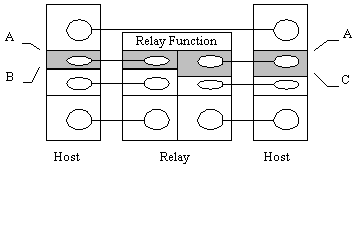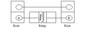 In figure 3 the service at interface "A" is common to all hosts and relays. This is particularly advantageous as it makes the "Relay Function" very simple to specify. In response to ?.inds and ?.confs received from one side it generates ?.reqs and ?.resps on the other. The "objects" that are being relayed are effectively (N)SDUs and we have what is called a "service relay".