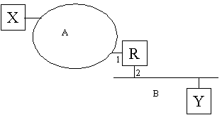 We illustrate the steps involved by considering the passage of a packet through the internetwork in figure 5. Here A is a token ring, B is an Ethernet, X and Y are hosts and R is an Internet router (i.e. a service relay). X wishes to send an IP datagram to Y. There are 4 points of attachment present; one each for X and Y and 2 for the router. Each of these will have an SNPA address - MAC addresses in this case. Each must also have an IP address. Since A and B are connected via a router, Internet rules state that they must operate as separate IP "networks"- say 128.16 and 192.40 respectively. Thus the addresses might be as in table 1 (note that the actual values of the SNPA addresses are irrelevant so these are represented symbolically.
