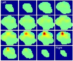 ![]() Figure 1a: Sagittal slices across 3D imageof absorption change in infant brain due to passive movement of left arm. |
